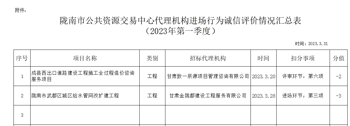 根據(jù)《甘肅省公共資源交易代理機(jī)構(gòu)管理辦法》(甘政辦發(fā)〔2019〕107號(hào))和《隴南市公共資源交易中心代理機(jī)構(gòu)進(jìn)場(chǎng)行為誠(chéng)信評(píng)價(jià)實(shí)施制度(試行)》規(guī)定,現(xiàn)對(duì)2023年第一季度,共2家代理機(jī)構(gòu)2條進(jìn)場(chǎng)行為誠(chéng)信評(píng)價(jià)記錄予以通報(bào)(詳見附表)。請(qǐng)各代理機(jī)構(gòu)嚴(yán)格遵守各項(xiàng)規(guī)章制度、誠(chéng)實(shí)守信,規(guī)范操作,為招標(biāo)人和采購(gòu)人提供專業(yè)、高效、規(guī)范的招標(biāo)代理服務(wù)。