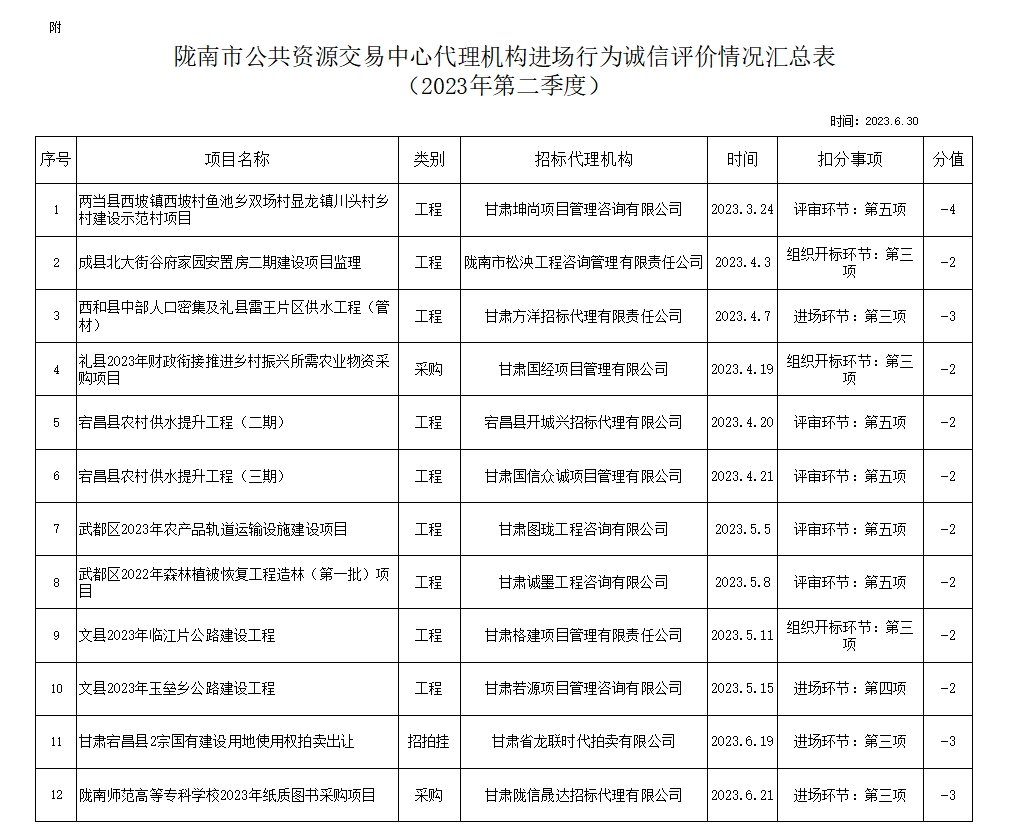根據(jù)《甘肅省公共資源交易代理機構(gòu)管理辦法》(甘政辦發(fā)〔2019〕107號)和《隴南市公共資源交易中心代理機構(gòu)進(jìn)場行為誠信評價實施制度(試行)》規(guī)定,現(xiàn)對2023年第二季度,共12家代理機構(gòu)12條進(jìn)場行為誠信評價記錄予以通報(詳見附表)。請各代理機構(gòu)嚴(yán)格遵守各項規(guī)章制度、誠實守信,規(guī)范操作,為招標(biāo)人和采購人提供專業(yè)、高效、規(guī)范的招標(biāo)代理服務(wù)。