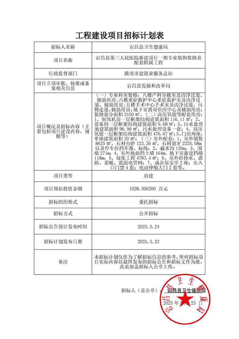 宕昌縣第三人民醫(yī)院新建項(xiàng)目一期專業(yè)裝飾裝修及配套附屬工程