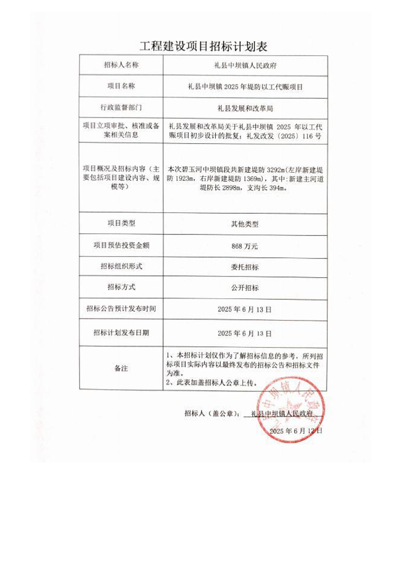 禮縣中壩鎮(zhèn)2025年堤防以工代賑項目