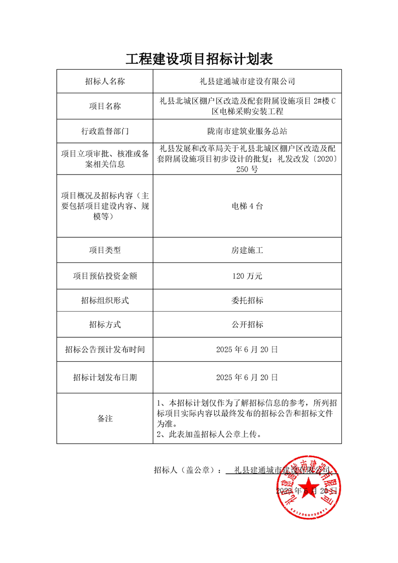 禮縣北城區(qū)棚戶區(qū)改造及配套附屬設施項目2#樓C區(qū)電梯采購安裝工程