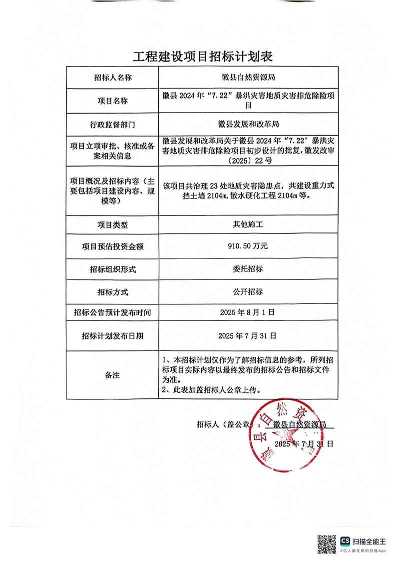 徽縣2024年“7.22”暴洪災害地質災害排危除險項目