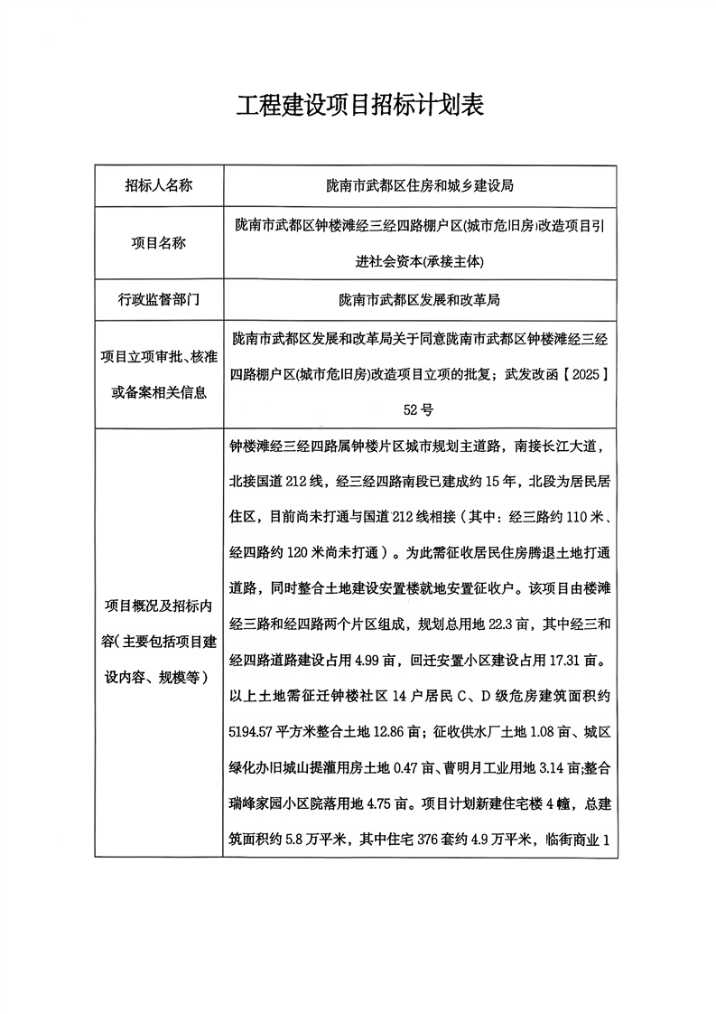 隴南市武都區(qū)鐘樓灘經(jīng)三經(jīng)四路棚戶區(qū)(城市危舊房)改造項目引進(jìn)社會資本(承接主體)