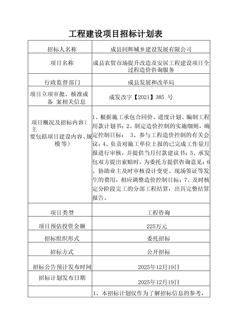 成縣農(nóng)貿(mào)市場(chǎng)提升改造及安居工程建設(shè)項(xiàng)目(一期)全過(guò)程造價(jià)咨詢服務(wù)
