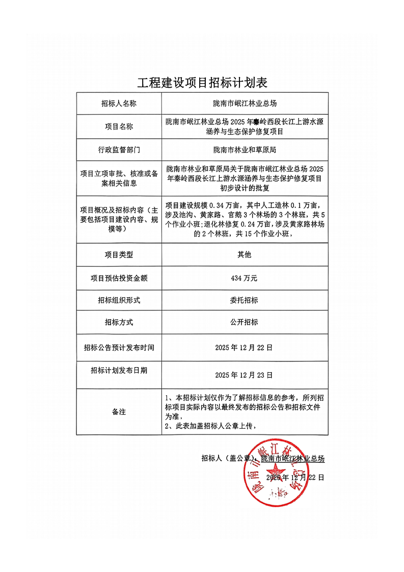 隴南市岷江林業(yè)總場2025年秦嶺西段長江上游水源涵養(yǎng)與生態(tài)保護修復(fù)項目