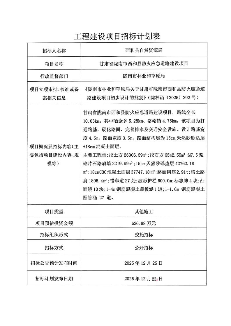 甘肅省隴南市西和縣防火應(yīng)急道路建設(shè)項(xiàng)目