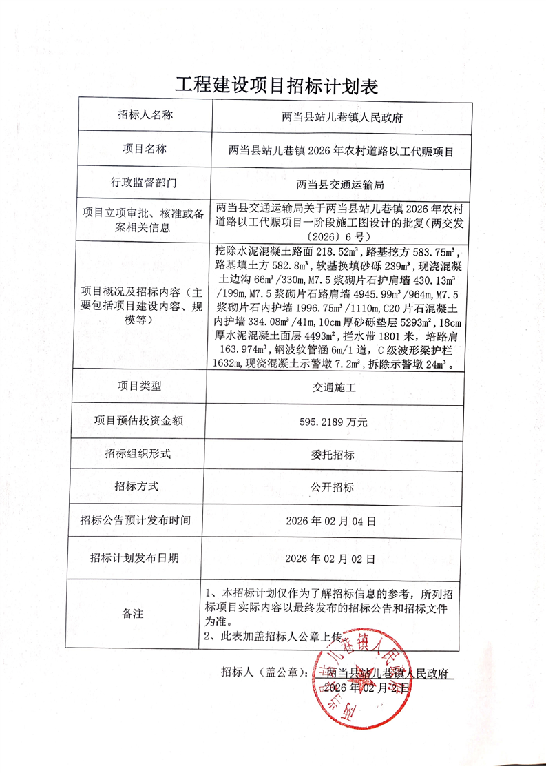 兩當(dāng)縣站兒巷鎮(zhèn)2026年農(nóng)村道路以工代賑項目