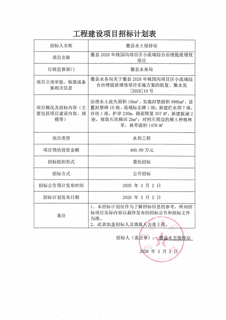 徽縣2026年桃園溝項目區(qū)小流域綜合治理提質(zhì)增效項目