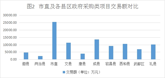 2.政府采購類項目:市直45項,交易額25563.29萬元;武都區(qū)36項,交易額6990.89萬元;成縣34項,交易額13577.85萬元;徽縣20項,交易額4778.48萬元;西和縣34項,交易額10655.60萬元;禮縣35項,交易額10150.20萬元;康縣23項,交易額3886.56萬元;文縣36項,交易額11436.30萬元;宕昌縣35項,交易額9173.00萬元;兩當(dāng)縣14項,交易額2284.08萬元。